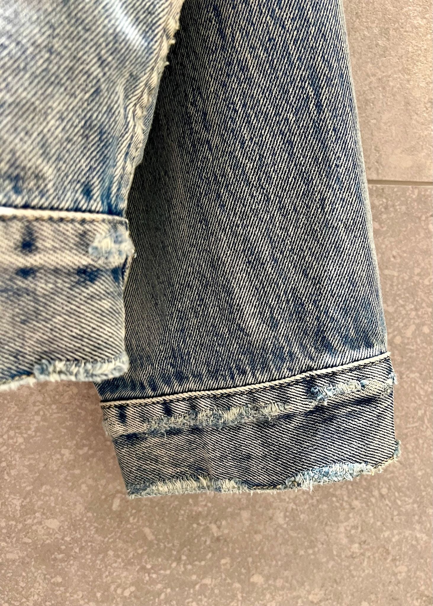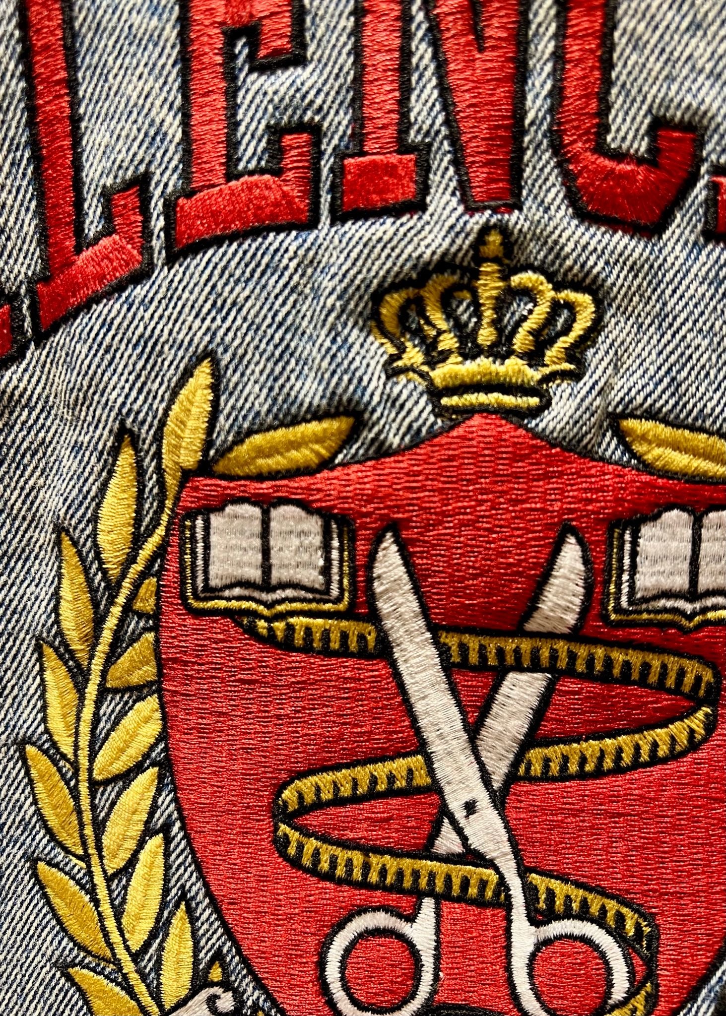 BALENCIAGA Embroidered Denim Jacket is a statement piece that elevates the wardrobe essential through bold graphic branding and premium construction, characteristic of the brand's luxury streetwear aesthetic under Demna.