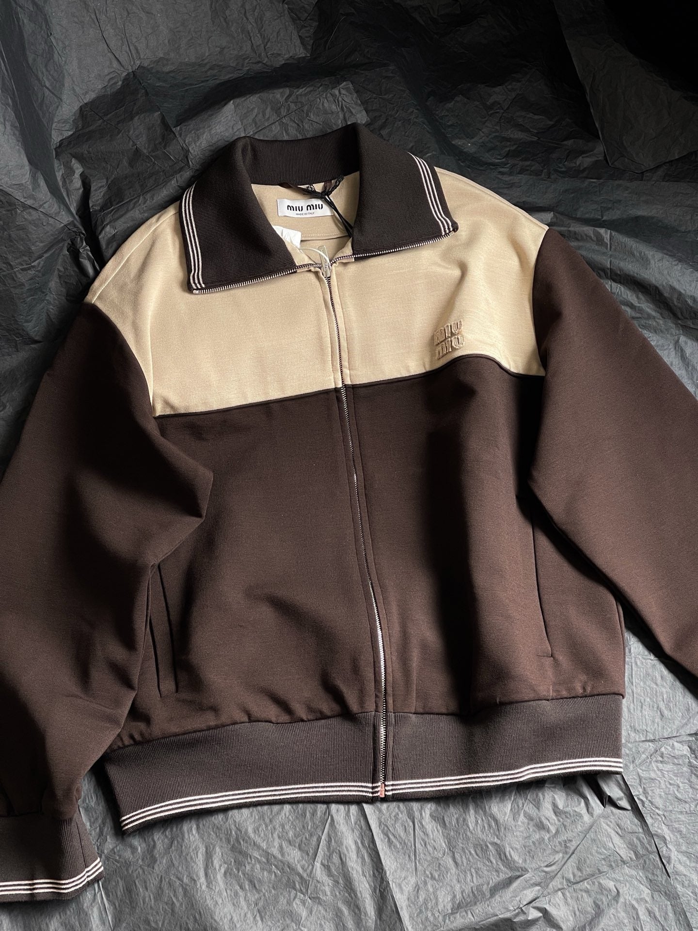 Miu Miu knitted-cuffs zip-front sweatshirt is a blend of athletic wear and contemporary luxury, often taking inspiration from vintage sporty styles but elevated with signature Miu Miu detailing.